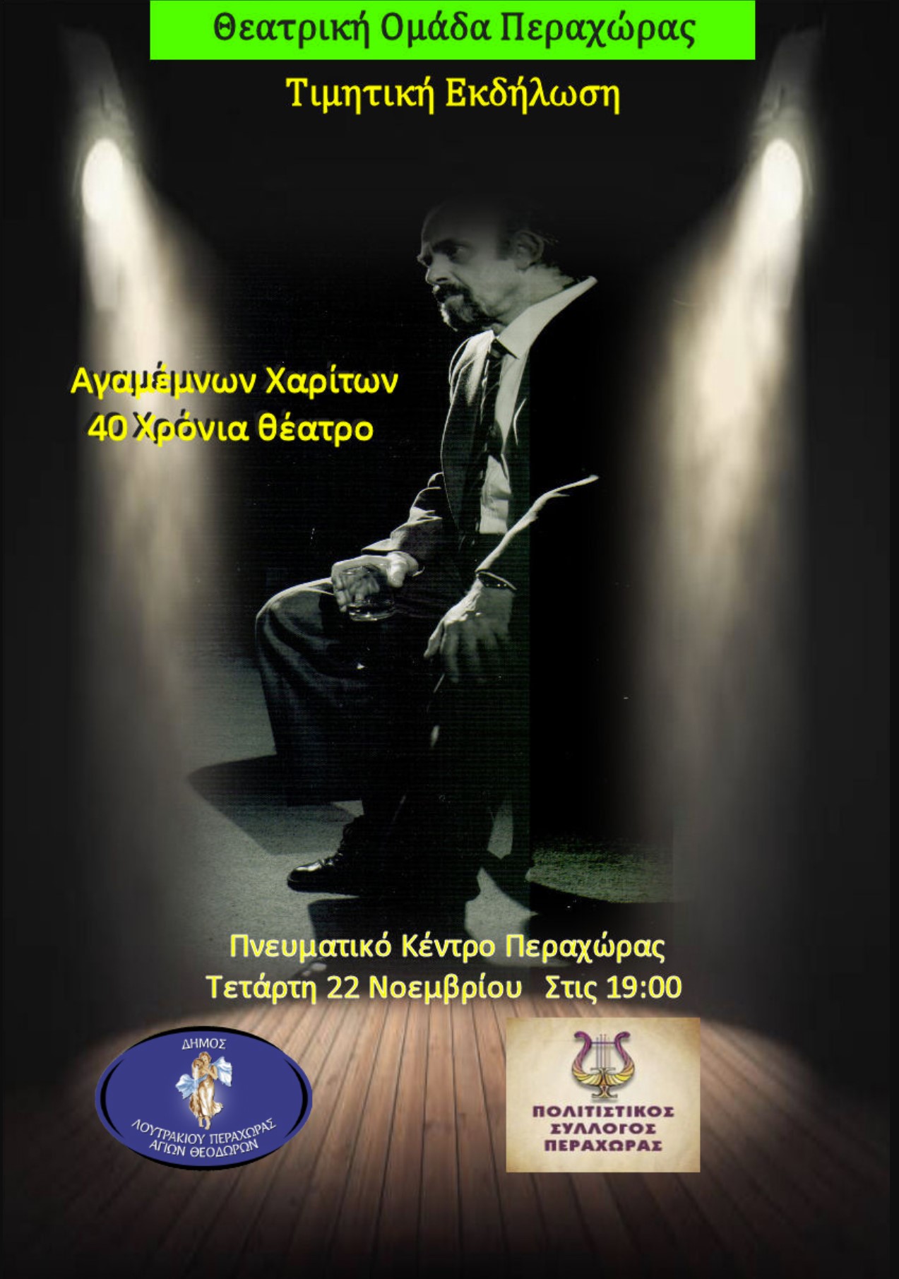Η Θεατρική Ομάδα Περαχώρας μας προσκαλεί στην εκδήλωση – αφιέρωμα στον Αγαμέμνων Χαρίτων, για τα 40 χρόνια θέατρο, 40 χρόνια προσφοράς στον πολιτισμό.