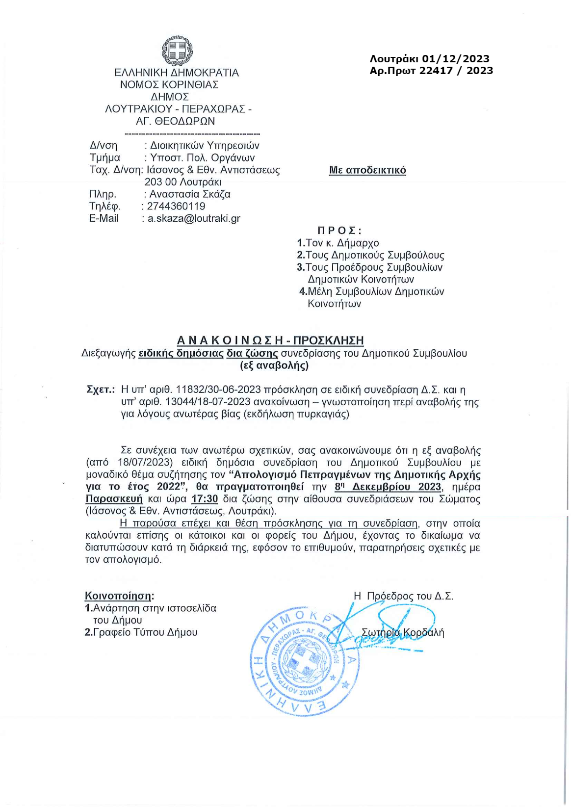1_ΚΟΡΙΝΘΙΑΔΗΜΟΣ ΛΟΥΤΡΑΚΙΟΥ Λουτράκι: 8 Δεκεμβρίου απολογισμός πεπραγμένων δημοτικής αρχής By SFEDONA 06/12/2023 ShareTweet 0 8 Δεκεμβρίου ημέρα Παρασκευή θα γίνει ο απολογισμός πεπραγμένων της δημοτικής αρχής.