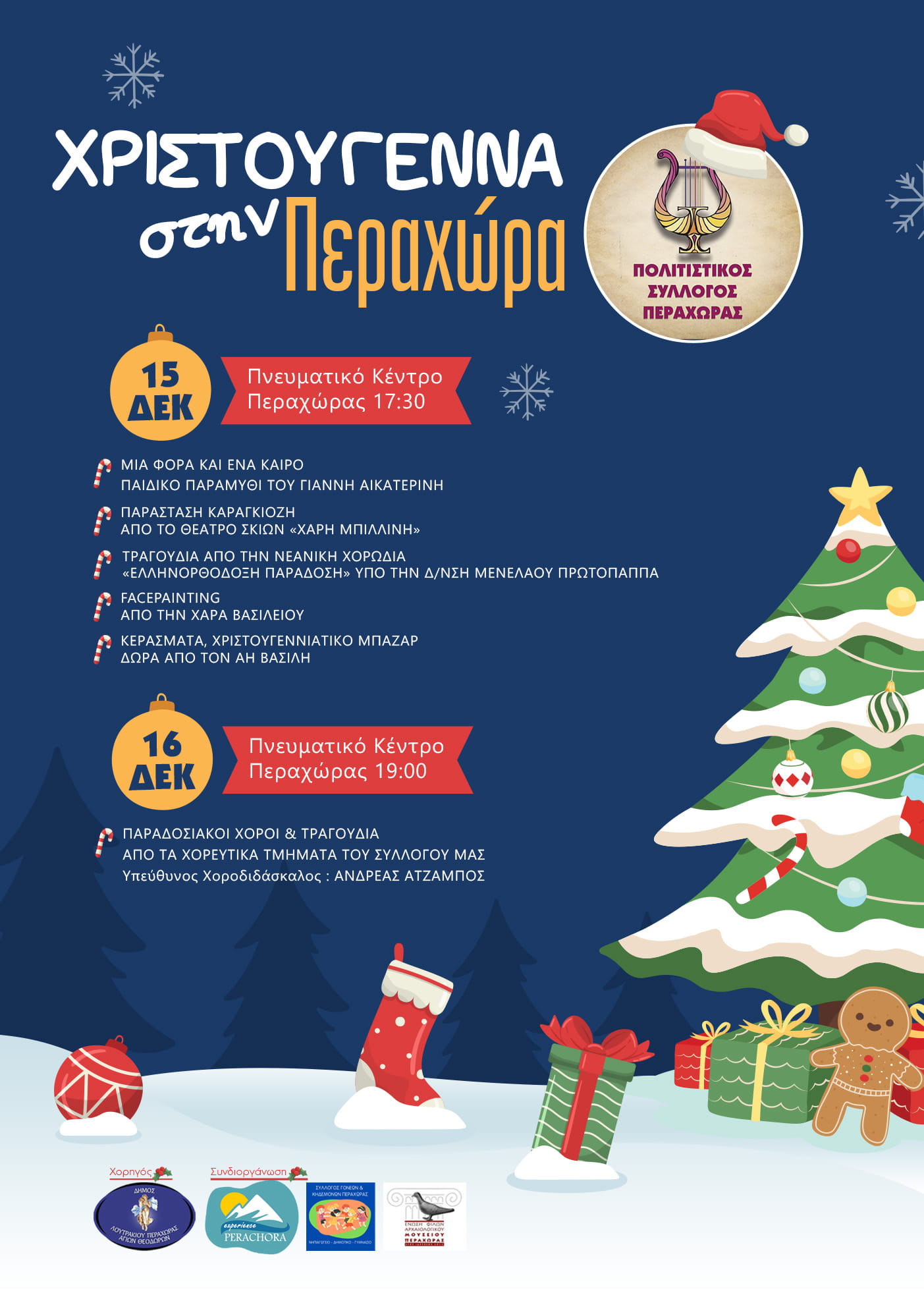 Το Χριστουγεννιάτικο πρόγραμμα εκδηλώσεων 15 Δεκεμβρίου στο Πνευματικό Κέντρο Περαχώρας & ωρα 17:30 εχει ως εξής: