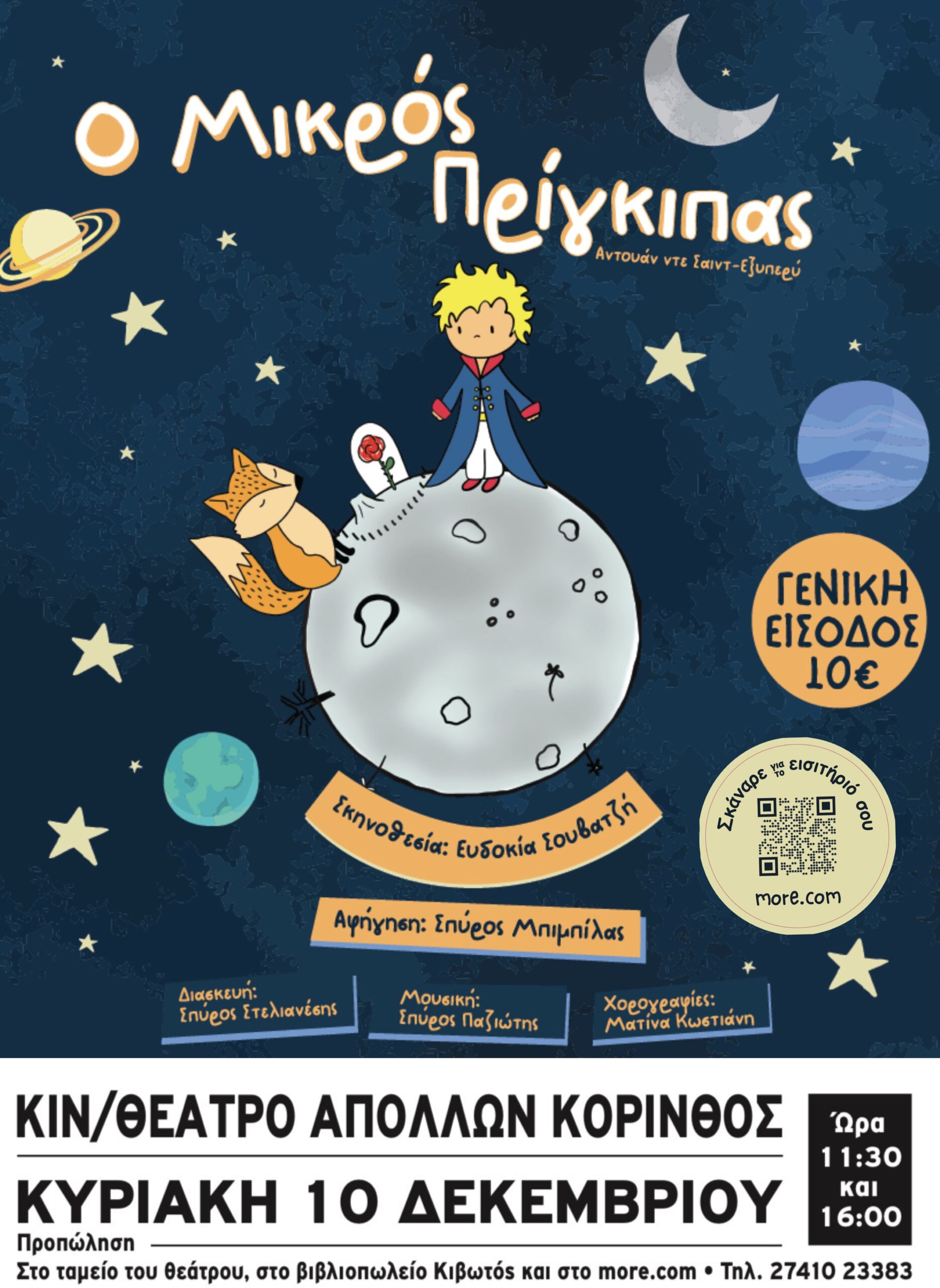 Το αλληγορικό παραμύθι του Αντουάν ντε Σαιντ-Εξυπερύ σε μια θεατρική εκδοχή για παιδιά, η οποία αναδεικνύει τις πανανθρώπινες αξίες της φιλίας, της αγάπης και της ανιδιοτέλειας. Ένα υπερθέαμα,γεμάτο τραγούδι,χορό και πολλά διδακτικά μηνύματα για τα παιδιά!