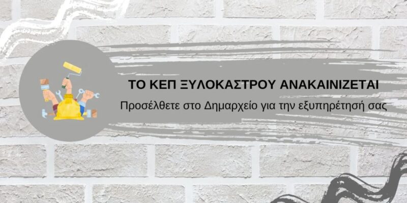 Σας ενημερώνουμε ότι το ΚΕΠ Ξυλοκάστρου θα παραμείνει κλειστό λόγω ανακαίνισης, η οποία υλοποιείται στο πλαίσιο του ψηφιακού μετασχηματισμού των δημόσιων υπηρεσιών του Δήμου μας. Ως εκ τούτου, η εξυπηρέτηση του κοινού θα πραγματοποιείται στην κεντρική είσοδο και στο ισόγειο του Δημαρχείου.