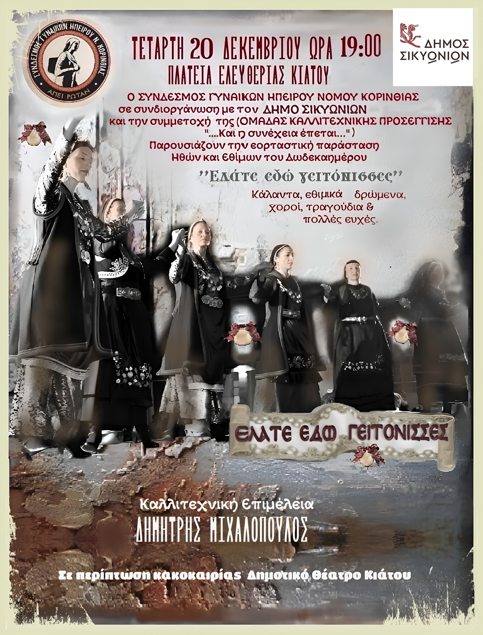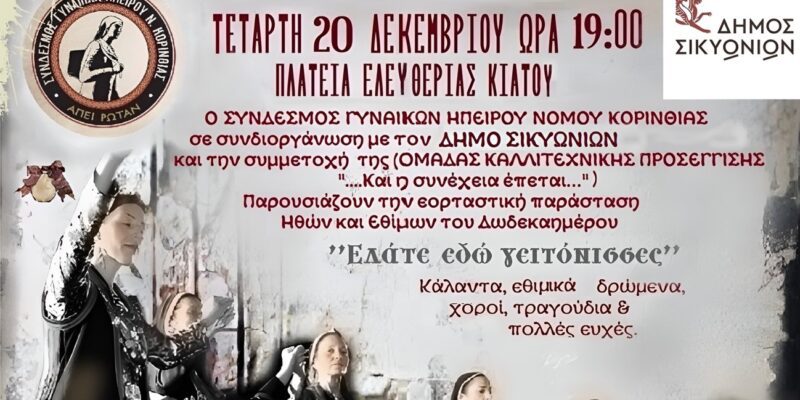 Ο ΣΥΝΔΕΣΜΟΣ ΓΥΝΑΙΚΩΝ ΗΠΕΙΡΟΥ ΝΟΜΟΥ ΚΟΡΙΝΘΙΑΣ σε συνδιοργάνωση με τον ΔHMO ΣΙΚΥΩΝΙΩΝ και την συμμετοχή της (ΟΜΑΔΑΣ ΚΑΛΛΙΤΕΧΝΙΚΗΣ ΠΡΟΣΕΓΓΙΣΗΣ “….Και η συνέχεια έπεται…” ) Παρουσιάζουν την εορταστική παράσταση Ηθών και Εθίμων του Δωδεκαημέρου