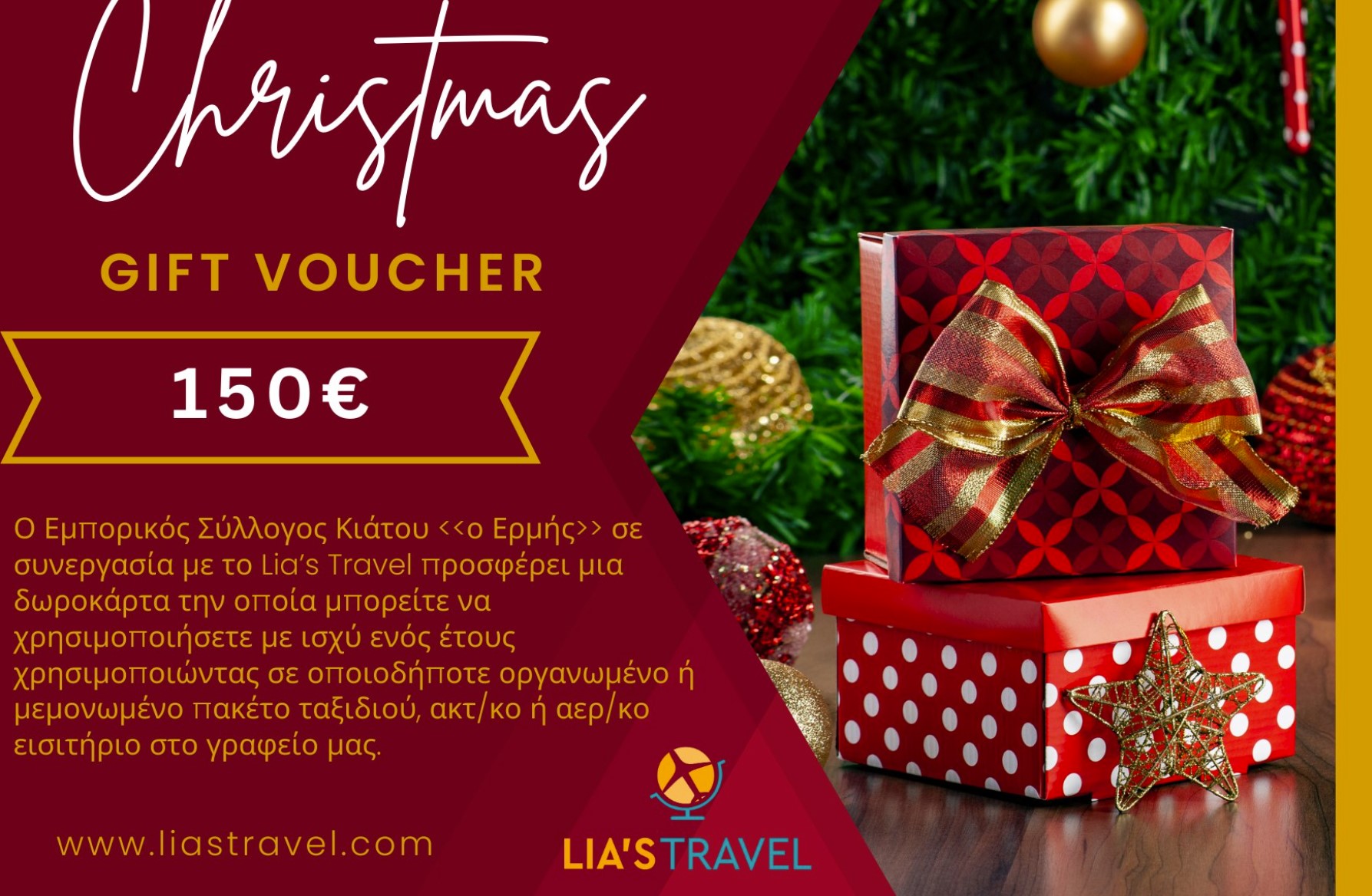 Ψωνίζετε από τα καταστήματα της πόλης , με αγορές από 100€ και άνω συμμετέχετε στην κλήρωση και κερδίζετε ένα ταξιδιωτικό κουπόνι αξίας 150€ από το ταξιδιωτικό γραφείο Lia’s Travel με ισχύ εξαργύρωσης ενός έτους.