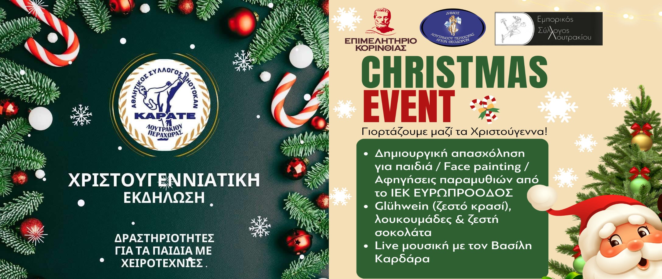 Σήμερα το απόγευμα, στις 5 μ.μ, ο Α.Σ Shotokan Λουτρακίου – Περαχώρας Καράτε έχει διοργανώσει Χριστουγεννιάτικη εκδήλωση με γλυκίσματα, αναψυκτικά και φυσικά δραστηριότητες για παιδιά με χειροτεχνίες στο παραλιακό πάρκο, ενώ αύριο Πέμπτη, στην πλατεία 25ης Μαρτίου το μεγάλο Χριστουγεννιάτικο event του Επιμελητηρίου, του Δήμου και τους Εμπορικού Συλλόγου με πολλές δραστηριότητες! Από τις 4μ.μ – 8μμ.