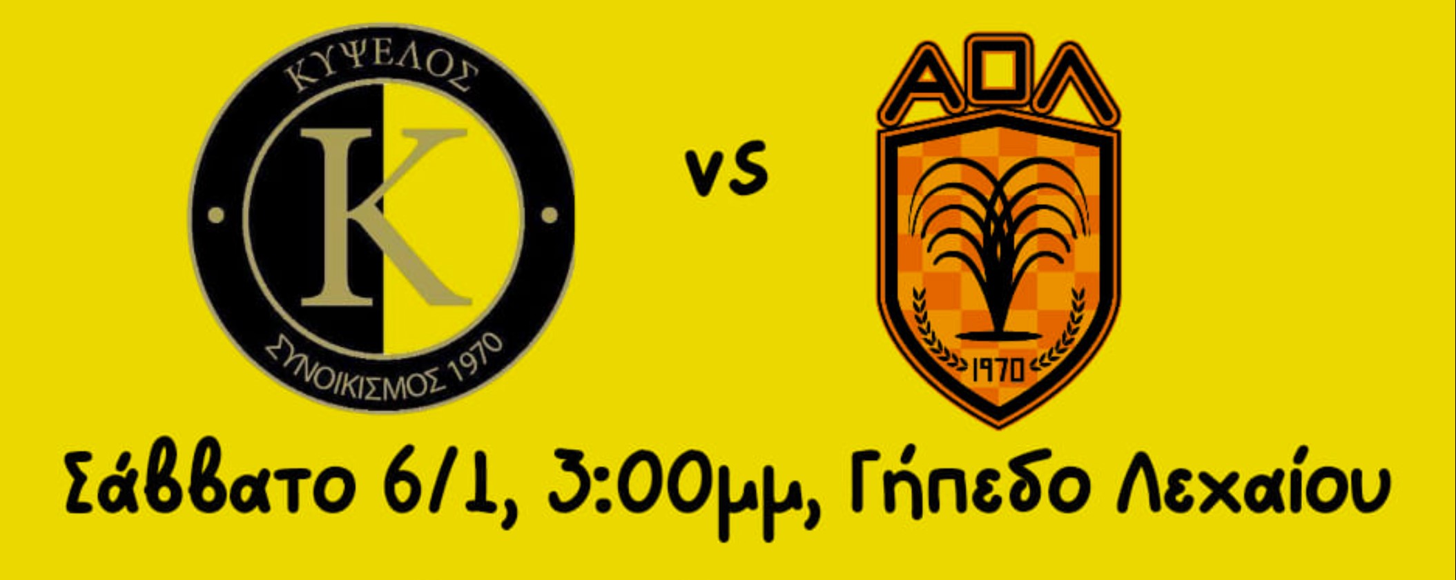 Στο γήπεδο του Λεχαίου αναμετρώνται το προσεχές Σάββατο 6 Ιανουαρίου (ημέρα εορτασμού των Θεοφανείων) ο ΠΑΣ Κύψελος και ο Α.Ο.Λ. στον πρώτο αγώνα της χρονιάς . Ο αγώνας θα ξεκινήσει στις 3:00 μ.μ  και οι δύο ομάδες θέλουν την στήριξη των φιλάθλων με την παρουσία τους στο γήπεδο.
