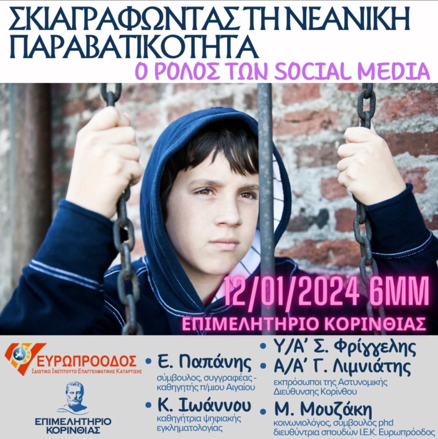 Με αφορμή την αύξηση των δεικτών παραβατικότητας των νέων στη χώρα μας, το ΙΕΚ ΕΥΡΩΠΡΟΟΔΟΣ σε συνεργασία με το Επιμελητήριο Κορινθίας διοργανώνουν στην Κόρινθο ημερίδα με θέμα “Σκιαγραφώντας τη νεανική παραβατικότητα: ο ρόλος των socialmedia”. Πρόκειται για ένα εξαιρετικά ανησυχητικό φαινόμενο που οι αιτίες του είναι πολυδιάστατες, επηρεάζοντας το σύνολο της κοινωνικής ζωής και έχοντας σαφές αντίκτυπο μακροπρόθεσμα στην ίδια την κοινωνία.