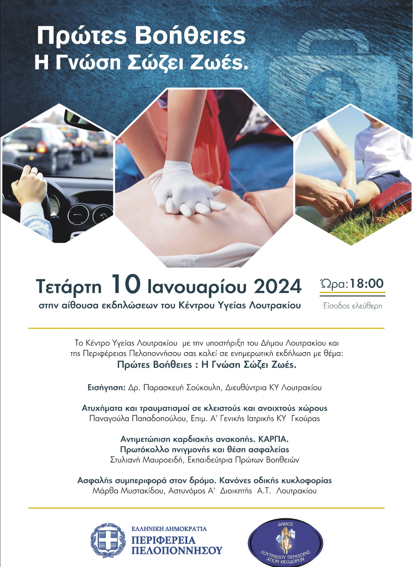 Το Κέντρο Υγείας Λουτρακίου με την υποστήριξη του δήμου και της Περιφέρειας διοργανώνει ενημερωτική εκδήλωση με θέμα: “Πρώτες Βοήθειες – Η Γνώση Σώζει Ζωές”. Η ημερίδα θα γίνει στην αίθουσα εκδηλώσεων του Κ.Υ. Λουτρακίου, την Τετάρτη 10 Ιανουαρίου στις 6μμ, με εισηγήτρια την Δρ. Παρασκευή Σούκουλη, Διευθύντρια του Κέντρου Υγείας.