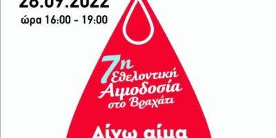 Ο Εμπορικός & Επιχειρηματικός Σύλλογος Βραχατίου διοργανώνει την Τετάρτη 28 Σεπτεμβρίου 2022, την 7η Εθελοντική Αιμοδοσία. Λόγω ...